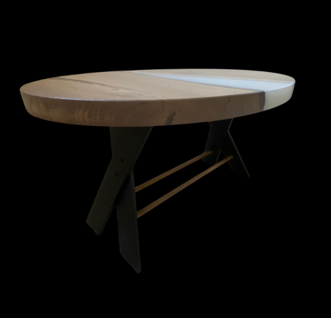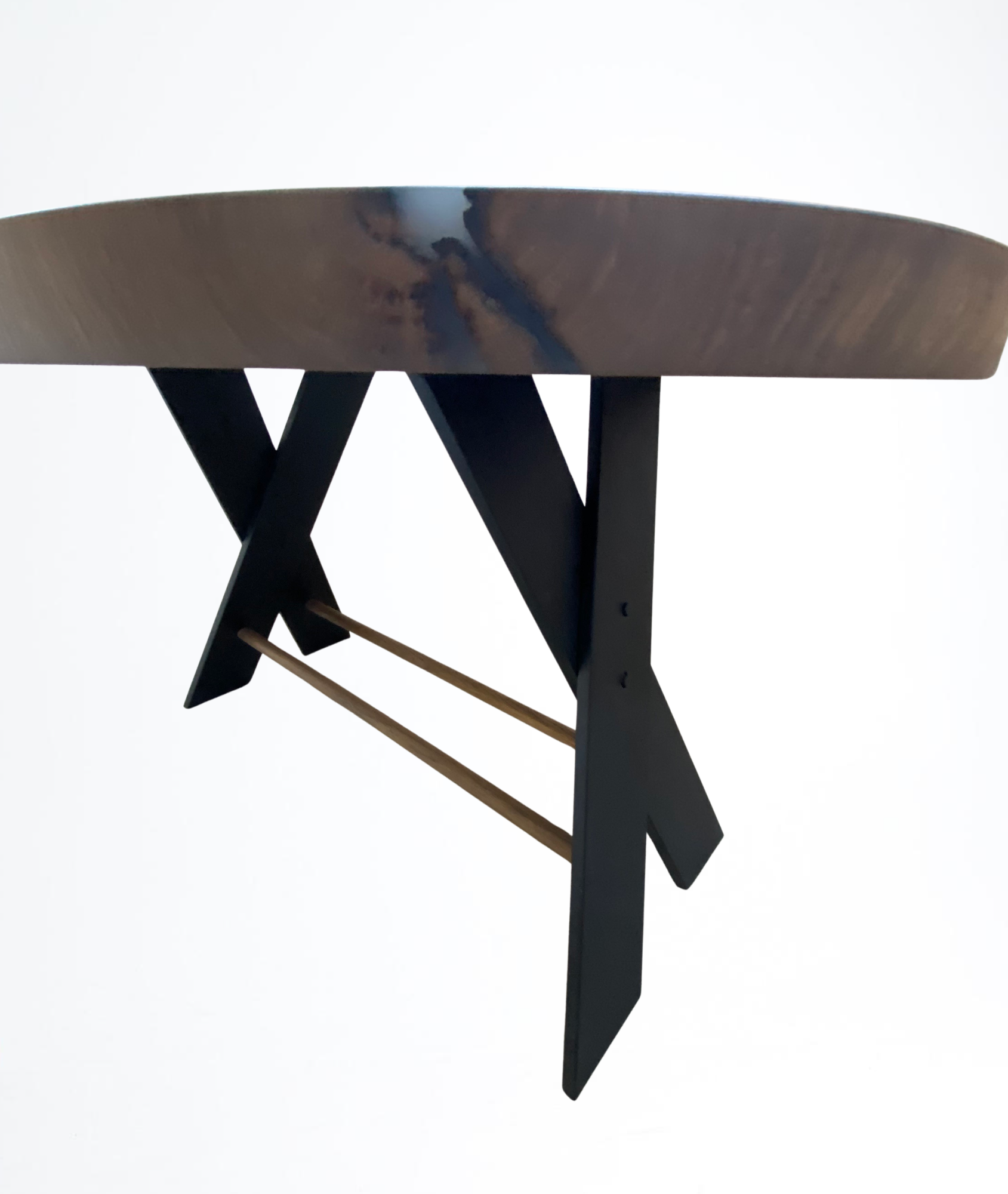 Pour compléter ce design, les pieds en forme de croix sont également en bois massif et teinté noir pour évoquer l'aspect moderne de l'acier. Les barres rondes sont en chêne et viennent rappeler le plateau de la table. L'ensemble crée une cohésion visuelle.
