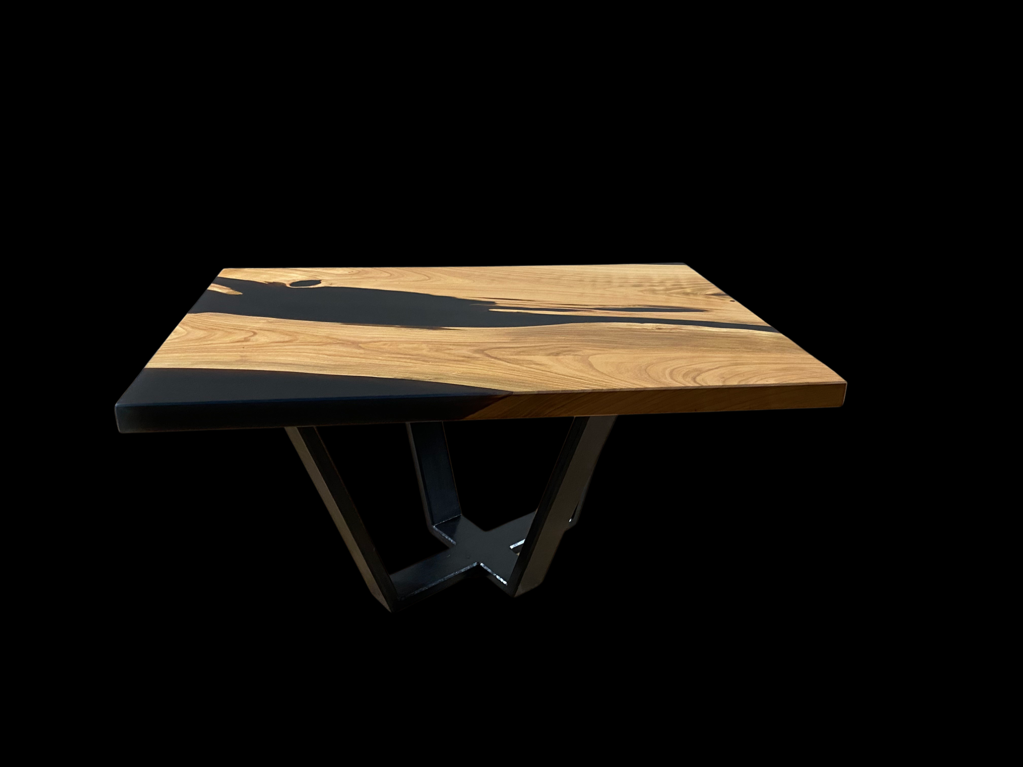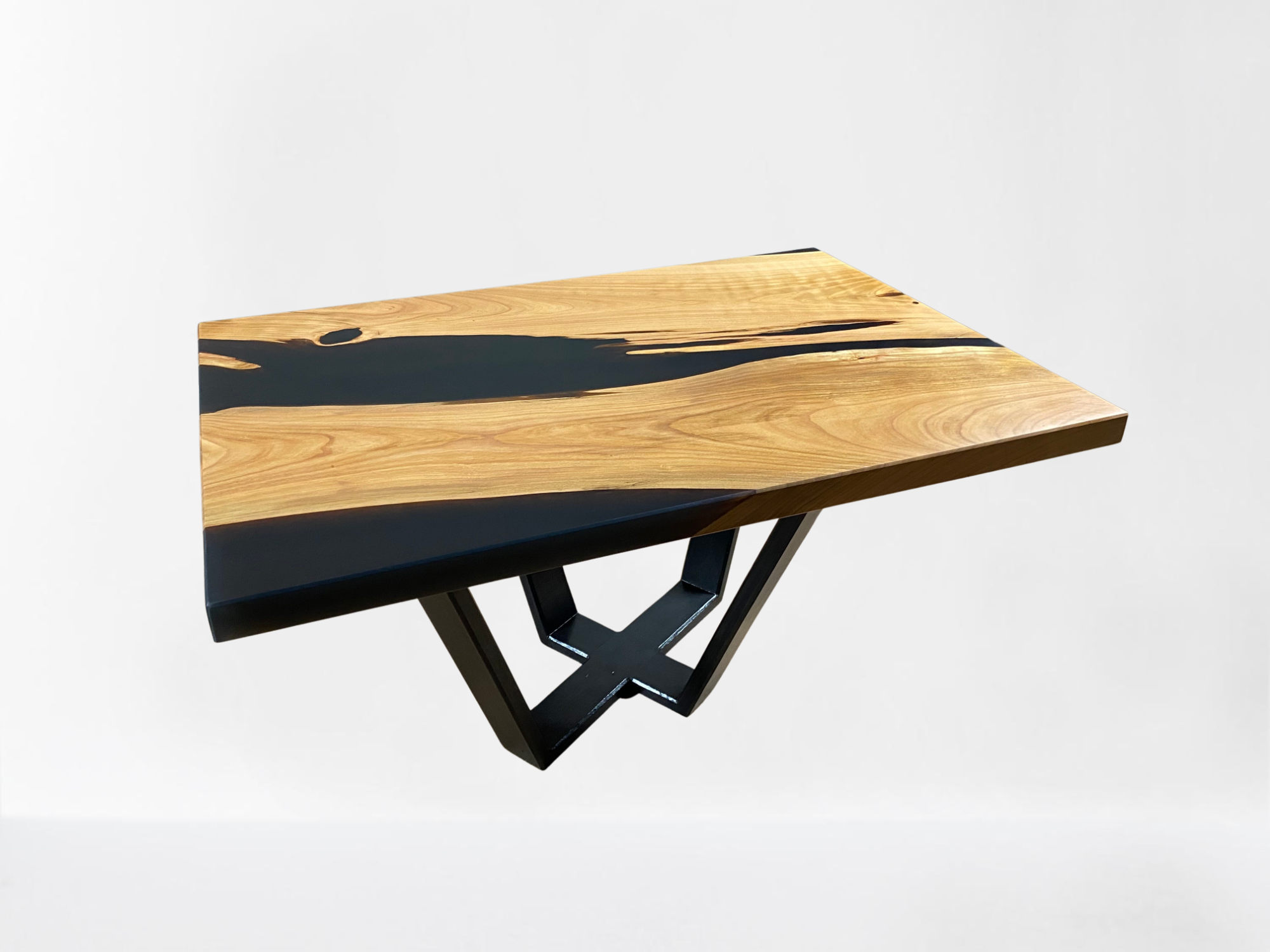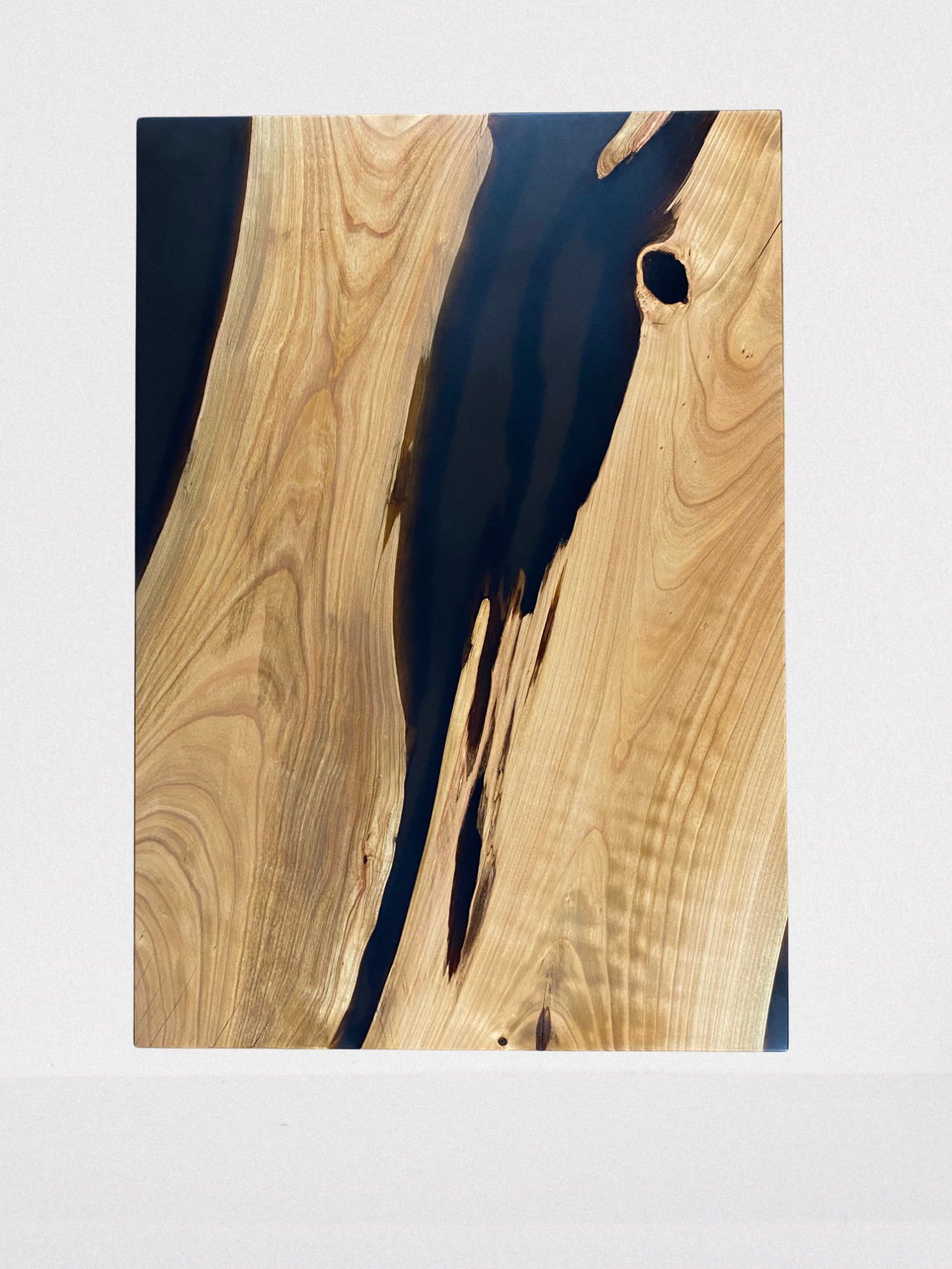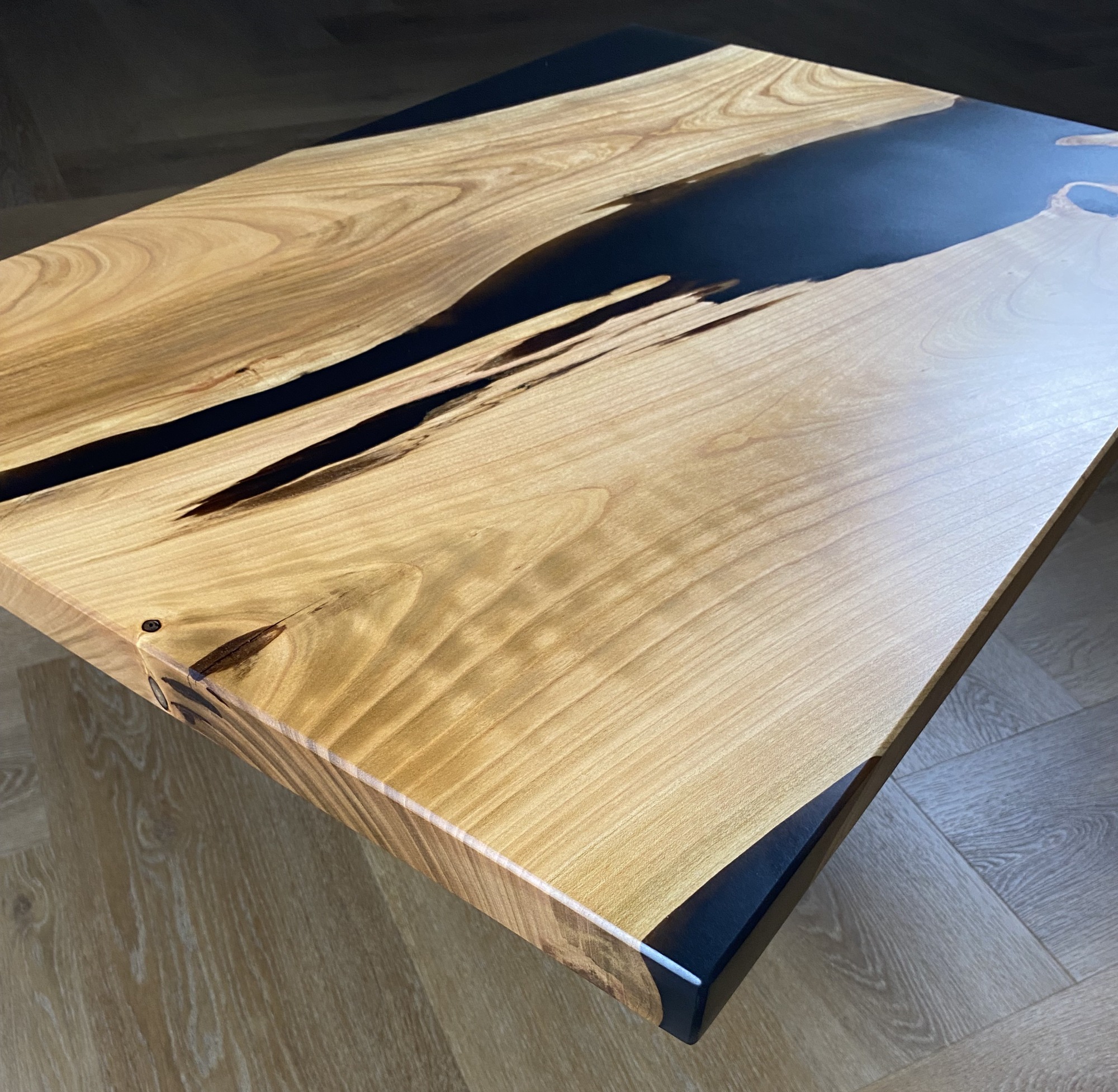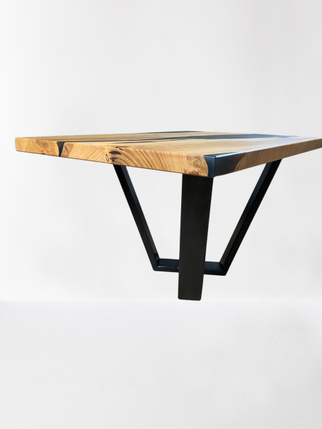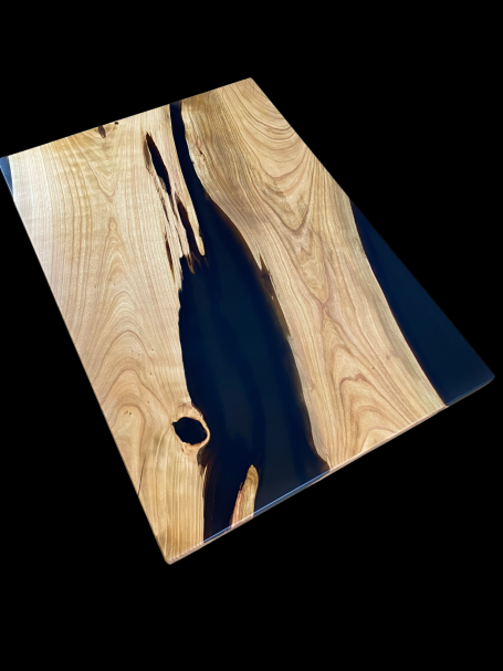 La chaleur naturelle du merisier, avec ses nuances dorées et ses veines délicates, crée une ambiance accueillante pour votre salon, tandis que la résine époxy noire ajoute une touche de contraste audacieuse et raffinée, soulignant la beauté du bois et mettant en valeur son caractère unique.