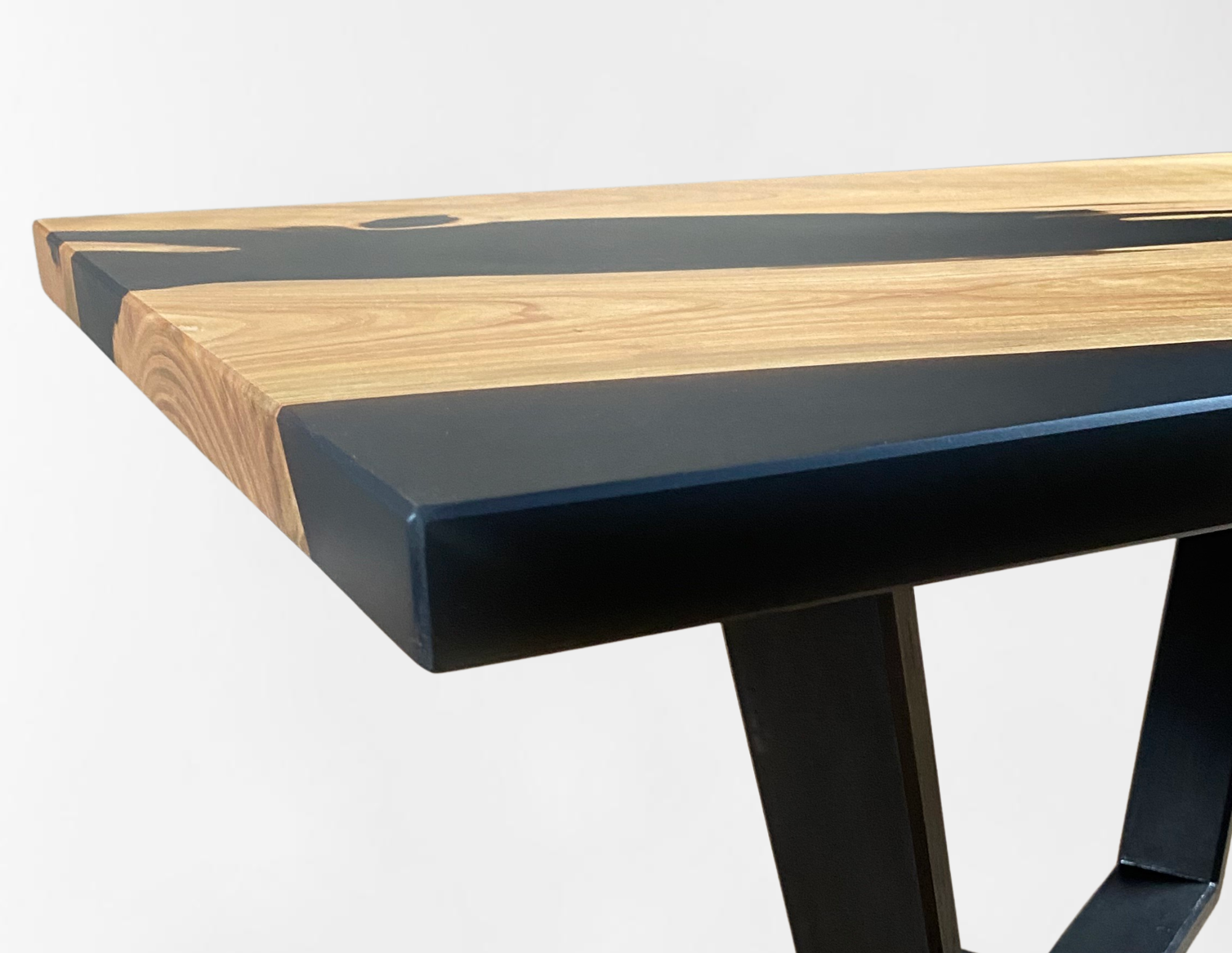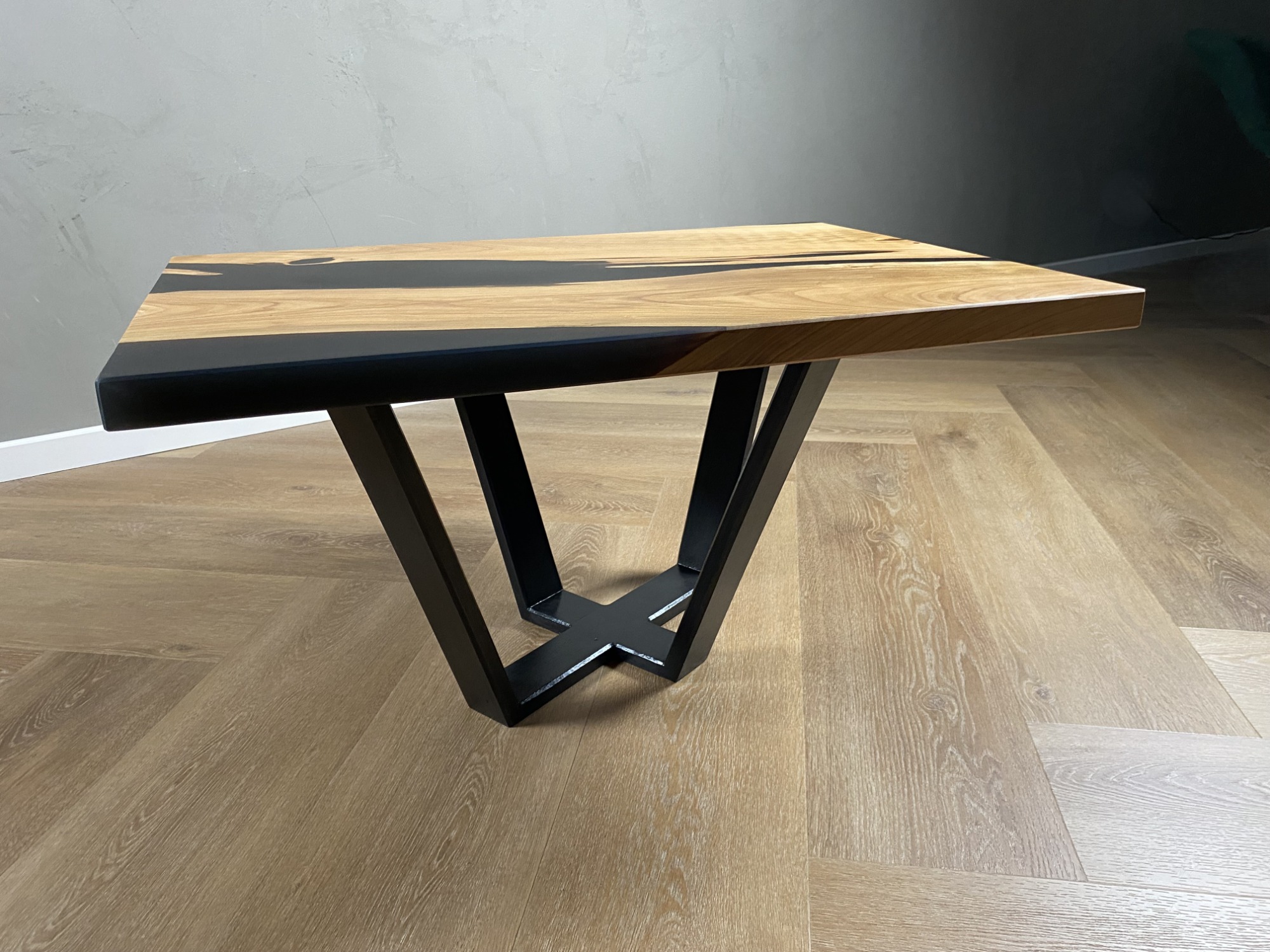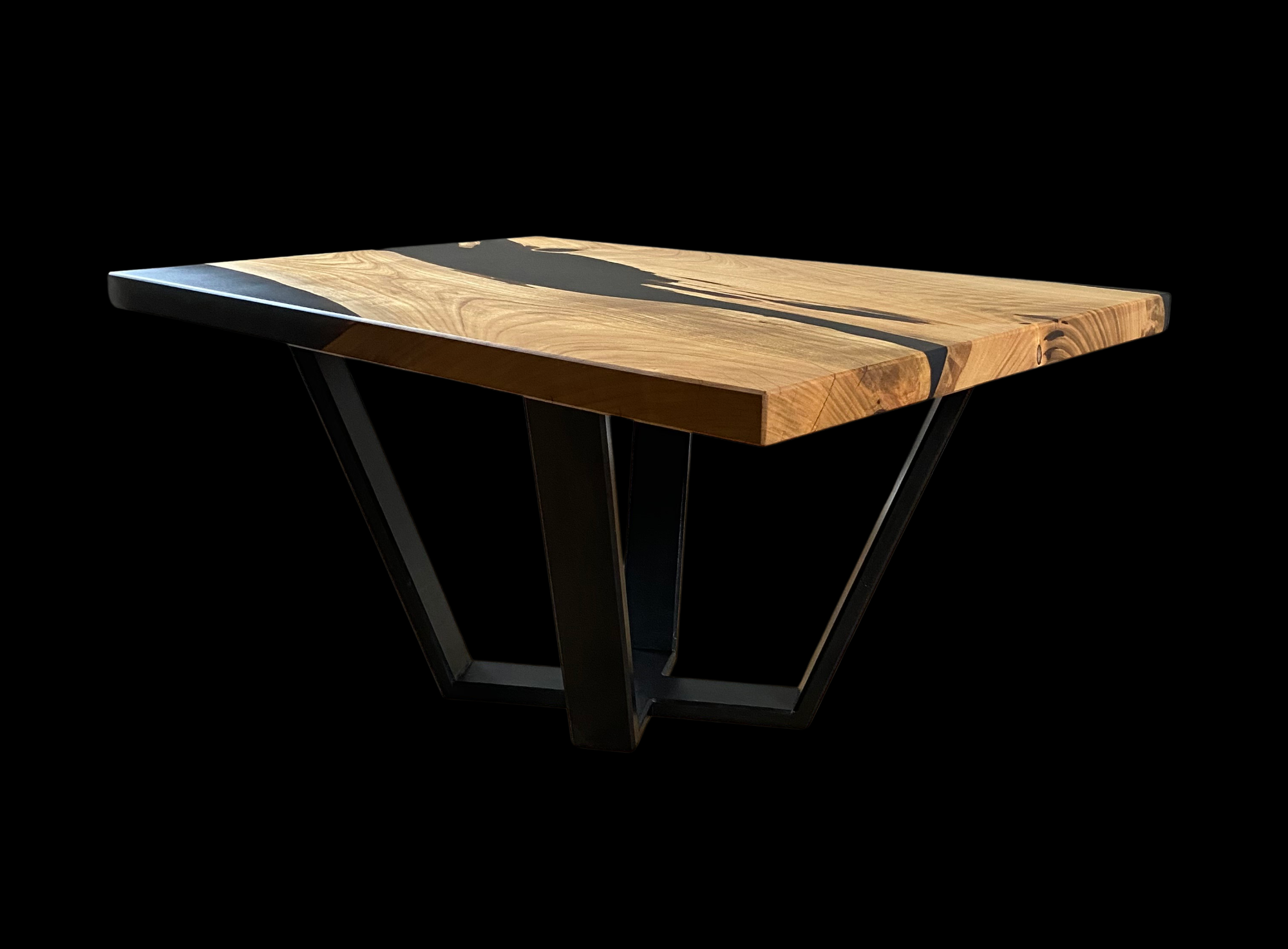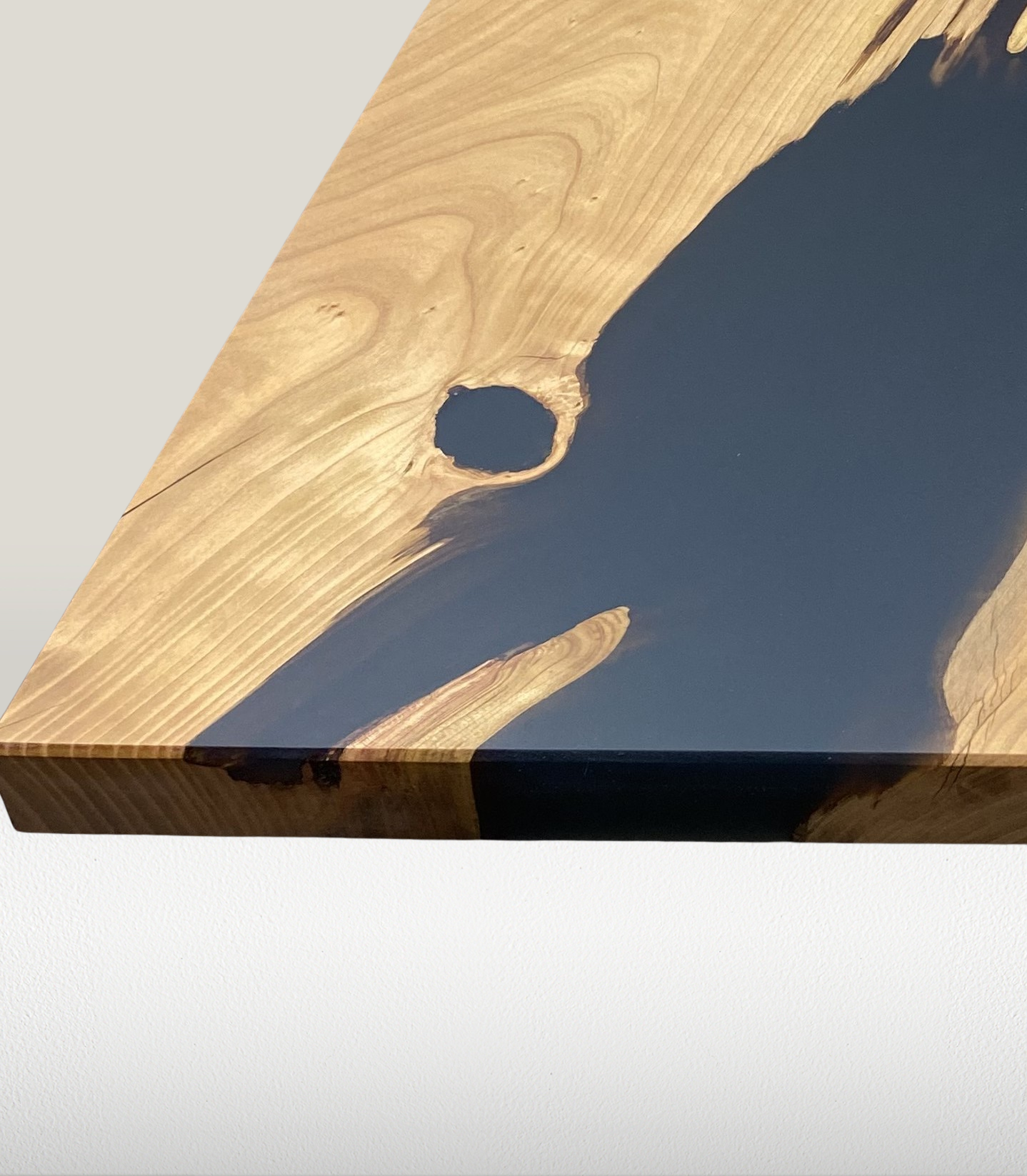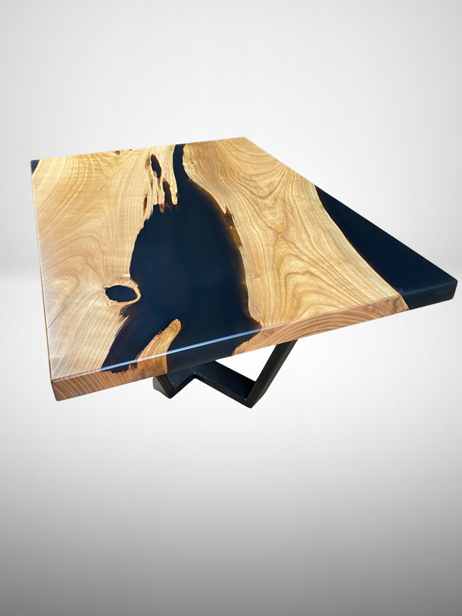 La chaleur naturelle du merisier, avec ses nuances dorées et ses veines délicates, crée une ambiance accueillante pour votre salon, tandis que la résine époxy noire ajoute une touche de contraste audacieuse et raffinée, soulignant la beauté du bois et mettant en valeur son caractère unique.